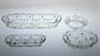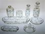 Art - Deco osmidílná toaletní souprava z ikonické kolekce "LORD", čiré lisované sklo, které je zušlechtěné zlacením a jemným ručně malovaným květinovým dekorem. Mělký geometrický reliéf ve skle vytváří optický efekt. Autorem návrhu této mezinárodně úspěšné kolekce skla byl v roce 1921 sklářský výtvarník Rudolf SCHRÖTER (*1887), provedla sklárna Josef INWALD. Dobrý stav, jen na víčku dózy je drobný oťuk (viz posl. foto). Rozměr - velký flakon v. 17cm, široká miska š. 25cm