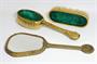 Vzácně vídaná honosná souprava z malachitového - Jade skla s plastickým reliéfem amorků a květin. Dva kartáče a zrcátko s fazetou v kovové montáži ( velmi jemná filigránská práce ), na úpravu šatů a vizáže. Luxusní doplněk garderóby dámy z první poloviny minulého století, období ART - DECO. Kolekce skla krystalerie Curt SCHLEVOGT s obchodní označením INGRID. Dobrý stav, rozměr - d. 30cm, 28cm a 17cm