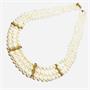 Elegantní, nadčasový perlový náhrdelník. Šperk tvoří čtyři řady bílých, kultivovaných perel o průměru cca 4,9 mm. Řady jsou navzájem spojeny zdobným, dekorativními sloupky ze 14ti karátového zlata. Zapínání taktéž. Celková váha zlata vyčíslena Puncovního úřadem na 6,75 g. Celková váha náhrdelníku 54,05.g. Délka cca 47 cm. Perfektní stav.