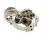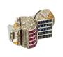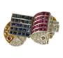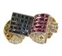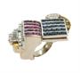 Naprosto výjimečný futuristický šperk je de facto drobným architektonickým dílem, zhotoveným na zakázku v roce 1936. Na jeho výrobu byla použita platina ryzosti 950/1000 a několik drobných detailů včetně dvou linek na šíně je ze žlutého zlata. Rozměrná hlava s motivem otevřené knihy, na jejíchž listech je mistrovsky zafasováno 25 přírodních rubínů celkové hmotnosti 2,60 ct a 25 safírů hmotnosti 3,87 ct. Prsten dále zdobí kvalitní přírodní brilianty dvou odstínů - čiré a Champagne, celkové hmotnosti 3,13 ct.