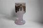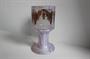 Válcová číše na těžké roztočené noze, čiré sklo přejímané barevnou sklovinou. Broušené a vybarvené ovocné festony, broušený čtvercový štítek s řezaným nápisem Dieses Glas wurde am 16. Juni 1853. durch Fritz A. Walentin Geblasen. Výška 14,9 cm, průměr okraje 7,5 cm.