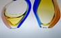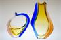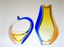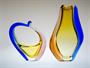 Autorské hutní sklo organických tvarů - váza a košík ze souboru ROMANA, půvabně barevné, několikrát navrstvené sklo s tzv. Sommerso efektem, ambrové jádro je přejímané čirým sklem a dekorované dvěma nálepy v odstínu rosalín a kobaltová modř. Kolekce hutního skla ROMANA je návrhem z roku 1960 od sklářské výtvarnice - Hana MACHOVSKÁ ( *1937 ), provedla sklárna Mstišov u Teplic (košík se stal symbolem výstavy o sklárně Mstišov v r. 2015 "Sklo ze Mstišova známé - neznámé" viz posl. foto) . Dobrý stav, rozměr v. 25cm a v. 17cm