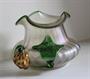 Čiré sklo, foukané do žebrované formy, s nálepem zeleného listu a čirého zlaceného plodu, s laločnatým okrajem se zeleným zakončením, irizované, zapálený okraj, zabroušené dno. Výška 10,5 cm, šířka okraje 11,5 cm. Produkce sklárna Johann Lötz Witwe, Klášterský Mlýn (Klostermühle), připsáno. Příbuzný tvar výr. č. II-1220. Kol 1902. Lit.: Lötz, Böhmisches Glas 1880-1940, Band 1, Werkmonographie, Hrsg. Helmut Riecke ..., 1989 Prestel Verlag, München, Kunstmuseum Düsseldorf, Ernst Ploil, Wien, str. 149.