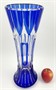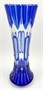 Bezbarvé a kobaltové sklo, ručně broušené. Ve stylu art deco. Vysoká elegantní váza ve stylu art deco ve tvaru přesýpacích hodin, kdy se válcovitě kuželovitý profil rozšiřuje směrem k hornímu okraji. Bezbarvé sklo přejímané sklem v barevnosti kobaltové modři. Ručně broušené svislé fazety vytvářející rytmický vzor s hroty, který připomíná okvětí leknínu či lotosu. Ve střední části pak ručně broušené pravidelné mírně reliéfní oválné ornamenty dekorované modrým kobaltovým sklem. Československo, minulé století. Výška 45,5 cm.