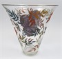 Bezbarvé sklo barevně leptané. Prostorově výrazná a velmi zajímavá váza tvaru obráceného zvonu z bezbarvého skla. Centrálním dekorem je barevně leptaný portrét mladé dvojice milenců. Zdobnost vázy podtrhují celoplošné lepty různě zbarveného podzimního listí. Československo, 30. až 50. léta minulého století. Výška 25,5 cm, průměr horního okraje 23,5 cm.