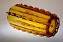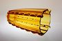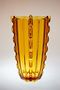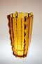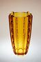 Velká masivní váza z ručně lisovaného ambrového skla s vlnkovými výstupky. Tvarosloví ART - DECO váza je tvarovaná do osmi hran a má čtyři řady vlnek, které vystupují nad vázu a tvoří zakončení hrdla. Stylový a dekorativní kus. Po roce 1920 provedly sklárny v severních Čechách, dobrý stav bez poškození, rozměr - v. 26cm, prům. 15,5cm