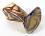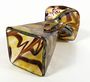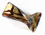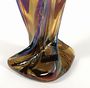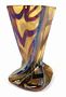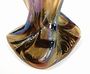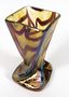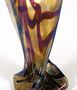Váza z čirého skla, které je zeleně vrstvené a hutně zpracované, zdobené zelenofialovým irisem. Váza pochází z Čech z počátku 20. století. Výška: 12,5 cm. Rozměry vrchní části: 7 x 7 cm.