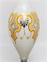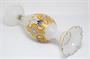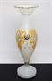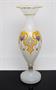Váza elegantního tvaru stojící na patce z opálového skla, které je zušlechtěné výrazně barevným malovaným geometrickým dekorem. Hrdlo vázy je bohatě tvarované brusem a zlacené, práce z druhé poloviny 19. století, pravděpodobně krystalerie na severu Čech. Jeden miniaturní oťuk (viz posl. foto), jinak dobrý stav. Rozměr - v. 30cm, prům. 10cm