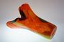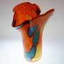 Půvabná hutně tvarovaná váza z výrazně barevného Tango skla, které je přejímané čirou sklovinou. Široce otevřené a organicky tvarované hrdlo, vespod je váza broušená s čočkou po heftu od sklářské píšťaly. Krásně barevný zatavený dekor, design z období 60-70tých let. Dobrý stav, rozměr - v. 25cm, š. 19cm