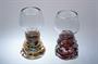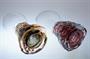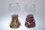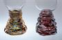 Autorské hutní sklo - vázy na jeden květ ve tvaru kalichu z kolekce hutního skla "KARDINÁL a ARAMIS". Masivní čirá patka je ovíjená barevnými niťovými nálepy a kalich je s ní propojen malým otvorem. Tvorba ze 60-70tých let, autorem je sklářský výtvarník a pedagog Josef Michal HOSPODKA ( *1923 +1989 ). Dobrý stav, rozměr - v. 17 a 18cm