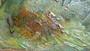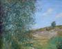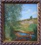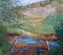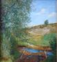 Olej na kartonu 34 x 31 cm. Signováno nečitelně vlevo dole s datací 1915 ? Krajinný pohled na travnatou stráň s klikaticí se pěšinou, vodní plochou a listnatým stromem v levé části obrazu. Zlacený rám s klenutou zdobenou horní částí. Celkový rozměr s rámem 38,5 x 36 cm.