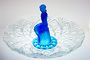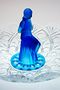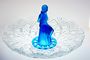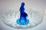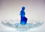 Jedinečná mísa na aranžování květin, jako jezírka s lekníny. Mísa se napustí vodou a do otvorů pod soškou sedící dívky se vloží krátce střižené květy na způsob leknínů a obklopují dívku, která si upravuje vlasy a ční nad vodní hladinou. Dvoudílná sestava z lisovaného skla, čiré a matované kobaltově modré sklo. Ve 30-40tých letech provedly sklárny v severních Čechách. Dobrý stav bez poškození, rozměr - prům. 40cm, v. 24cm