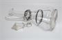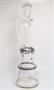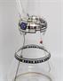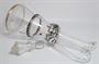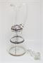 Karafa na víno z čirého skla z počátku minulého století, zušlechtěná malbou vypalovaným smaltem na pomezí dvou stylů: Geometrické secese a ART - DECO. Karafa je dekorovaná drobným stylovým ornamentem, velmi jemným v detailech a především motivem dvou srdíček, pravděpodobně jedná o předmět spojený se svatbou, či zásnubami. Vespod je broušená čočka po heftu od sklářské píšťaly. Zřejmě provedla některá z krystalerií v Kamenickém Šenově (podle provenience nákupu). Dobrý stav, rozměr i se zátkou v. 41cm, prům. 14cm