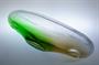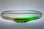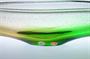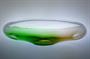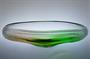 Prvotřídní mísa z masivního hutního skla, která má jádro z čiré skloviny s dekorem zatavených jemných bublinek a je navrstvené topasovým a zeleným ( Oceanit ) nálepem s hutním vpichem. Mísa má vzácně dochované dvě původní nálepky! ( exportní Bohemia Glass a sklárny, viz posl. foto ). Autorem je sklářský výtvarník František ŠPINAR ( *1935 +2008 ), provedla sklárna Ústředí uměleckých řemesel ve Škrdlovicích po roce 1975. Dobrý stav, rozměr - š. 36 x 12 x 10cm