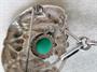 Nádherná stříbrná brož ovlivněná vídeňskou secesí, zhotovena ze stříbra ryzosti 925/1000, celková hmotnost 18,2 g, jehla obecný kov, šířka 4,5 cm, na výšku s ověsem 7,4 cm.