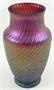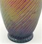 Fialové a zelené irizované sklo. Josef Rindskopf Söhne, Teplice - Šanov. Název vzoru : Ribbed-Mattiris. Období a styl : secese. Větší váza z fialového skla zeleně irizovaná. Zdobená po obvodu reliéfním stáčeným žebrováním. Kasického tvaru s kulatou patkou. Čechy 1905 - 1915. Výška 31 cm.