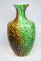 Ohromná secesní váza s barevným dekorem, který je natavený na opálovém jádru a přejímaný čirou sklovinou. Dekor je složen ze čtyř polí barev skla - dvě zelené s perleťovým chromaventurinem a dvě topasové. Velkolepý solitér z počátku minulého století. Provedly krystalerie v severních Čechách. Dobrý stav, rozměr - v. 34cm, prům. 18cm, hmot. 2,6kg