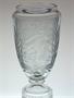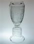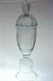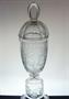 Velký luxusní pohár z čirého skla stojící na masivním soklu s celoplošně vypískovaným vystouplým dekorem na kterém je dobové zobrazení lyžaře a na soklíku lipová ratolest jako symbol vítězství. Na zadní straně je rytý nápis DRŽKOV 1961 a víko je broušené do širokých fazet. Pravděpodobně provedly sklárny v nedalekém Železném Brodě. Dobrý stav, rozměr v. 43cm, prům. 13cm