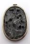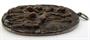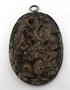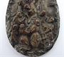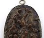 Galvanoplastika, bílý kov. Reliéfní motiv. Snímání těla Krista z kříže. V historizujícím styku. Oválná destička na čelní straně zdobena figurálním reliéfním námětem. Snímání z kříže. Zasazená v oválném kovovém rámečku s úchytem a kovovým závěsem. Ve stylu barokních přívěsků, které byly často zhotovovány jako upomínkový šperk na slavné a významné církevní oslavy. Evropa 1870 - 1910. Výška 9 cm, šířka 5 cm.