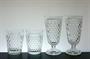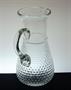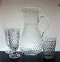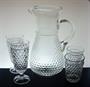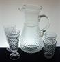 Nápojový soubor - vysoký elegantní více než sto let starý džbán z čirého skla foukaný do kovové formy se cvočkatým dekorem a hutně nalepeným uchem. Džbán má úctyhodný objem 3 litry a vespod je heft od sklářské píšťaly. Dva páry sklenic se stejným dekorem z ručně lisovaného skla. Soupravu pravděpodobně provedly krystalerie S.Reich & Co. Mariánská huť Velké Karlovice koncem 19, století. Dobrý stav, rozměr - džbán v. 30cm, š. 20cm, sklenice v. 17cm a v. 11cm