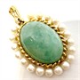 Efektní, půvabný zlatý závěs. Šperku dominuje vysoce kvalitní jadeit, který je zarámovaný souměrnými, sněhobílými perlami o průměru cca 3 mm. Šperk byl vyroben ze 14ti karátového zlata (585/1000), o celkové váze 5,10 g. Závěs disponuje větším, otvíratelným očkem, což skýtá možnost nošení jak na řetízku, tak i na na perlovém náhrdelníku. Rozměr 3,2 x 2,2 cm. Závěs byl profesionálně vyčištěn a je v perfektním stavu. Řetízek není součástí prodeje.