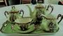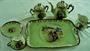 Exlkuzivní historický snídaňový set - tác,konvička, cukřenka, konvička na mléko a šálek s podšálkem. Vídeňský porcelán. Rozměry: tác 34 x 25 cm, výška konvičky 16 cm, cukřenky 12,5 cm, mlékovky 9 cm, šálku 5 cm (průměr 9 cm), průměr podšálku 14,5 cm.