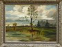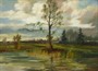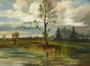 Olej na dřevěné desce 72 cm x 97 cm. Signováno vpravo dole. Autor obrazu: Viktor Rolín (1887-1942). Osamělý vzrostlý strom v poryvech větru stojící u vodní hladiny s rákosím pod zamračenou oblohou věštící příchod bouře. Originální galerijní rám francouzského typu s ornamenty ve stříbrné patině. Československo 1920 - 1935. Celkový rozměr s rámem 89 cm x 113 cm.