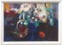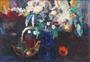 Olej na sololitu 48 x 69 cm. Signováno vpravo dole. Barevná svižná pastózní expresivní malba s barevnými akcenty květin a ovoce. Vzadu na plátnem pokrytém sololitu originální papírový štítek s popisem díla. Dobový světlý bílý profilovaný rámeček. Československo 1960 - 1980. Celkový rozměr s rámem 76 x 56 cm.