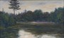 Olej na kartonu 27 cm x 43 cm. Signováno vpravo dole. Autor: Vlastimil Kačírek (1895-1970). Pohled za rozbřesku na zákoutí vodní plochy se zalesněnými břehy jimž korunuje ztepilá borovice. První sluneční paprsky prosvětlují hladinu. Stříbrný patinovaný rám. Československo 1920 - 1935. Celkový rozměr s rámem 35,5 cm x 51,5 cm.