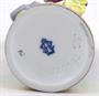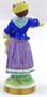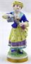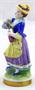 Dívka s lahví vína a džbánkem. Bílý, barevný ručně malovaný a zlacený porcelán. Porcelánka Volkstedt Rudolstadt založená roku 1762. V romantickém stylu. Porcelánová soška stojící dívky v barevných šatech se žlutou zástěrou, nalévající ze džbánku červené víno do lahve. Kruhový podstavec se zlatým pásem. Značeno zespodu: modrá písmena s korunou a letopočtem 1762, vtlačená čísla, černě malovaná značka malíře. Německo, Volkstedt Rudolstadt, minulé století. Výška 12,5 cm.