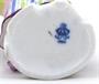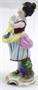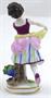 Bílý barevně ručně malovaný a zlacený porcelán. Porcelánka Volkstedt Rudolstadt založená roku 1762. V rokokovém stylu. Porcelánová soška tančící dívky v pruhované sukni držící v pravé ruce cíp žluté zástěry s položeným hroznem vína. Rokokově tvarovaný kulatý podstavec s hroznem modrého vína s listy. Značeno: modrá písmena s korunou, černě malovaná číslice malíře. Německo, Volkstedt Rudolstadt, minulé století. Výška 10,5 cm.
