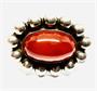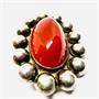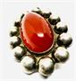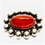 Elegantní, výrazná brož oválného tvaru z masivního stříbra. Šperku vévodí hladce broušený karneol v barvě lesního medu. Kámen rámují stříbrné, plastické kuličky o průměru cca 0,5 cm. Sterlingové stříbro (925/1000), celková váha 12,36 g. Rozměry 3,5 x 2,7 cm. Výborný stav.