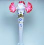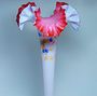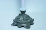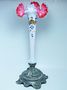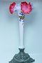 Půvabná větší váza z opálového ( mléčného ) skla, které je podjímané rubínem a hrdlo má tvar otevřeného květu. Sklo je dekorované malovaným florálním ornamentem pomněnek - vypalovaný smalt a zlato. Váza stojí pevně v nádherné kovové montáži s reliéfem dvou mužských hlav. Pravděpodobně provedly šumavské, nebo severočeské sklárny kolem roku 1900. Dobrý stav bez poškození,rozměr - v. 42cm, prům. 19cm