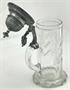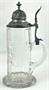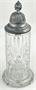 Čiré sklo ručně broušené, cín. V historizujícím stylu. Skleněný korbel válcovitého vyššího tvaru zdobený svislými fazetami, střídavý ornament kaménkového brusu, svislého klínového brusu a medailonu. Obloukovitě tvarovaná silnostěnná základna s broušenou hvězdou. Cínové klenuté kupolovité víčko s reliéfním dekorem a stylovým úchytem. Čechy 1880 - 1920. Výška 26 cm.