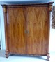 Třešňová dýha, originální mosazné kování. Období a styl: raný biedermeier. Zajímavá skříň zámeckého typu velkého rozměru ze sběratelsky cenného a velmi vyhledávaného období raného biedermeieru. Dvoudvéřová skříň s odstupňovanou profilovanou plochou a mírně předsazenou horní římsou. Dva postranní vysoké sloupky s patkami a hlavicemi. Hranolovité nohy. Černě mořené lišty a destičky. Originální zdobné mosazné kování s motivem poháru a Merkurovy hole. Čechy nebo Rakousko, kolem roku 1825. Rozměr skříně: výška 210 cm x šířka 180 cm x hloubka 66 cm.