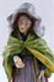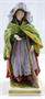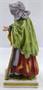 Bílý, barevný a zlacený porcelán. V romantickém stylu. Ernst Bohne Söhne, Rudolstadt. Stojící žena v pestrém barevném oblečení s širokým čepcem na hlavě, opírající se o hůl. Jednu svou ruku nataženou v gestu žebrání. Obdélný podstavec. Značeno vzadu na soklu modrou značkou. Německo 1900 - 1930. Výška 16,5 cm.