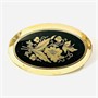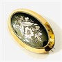 Dekorativní oválná brož z období biedermeieru, ústřední jemně rytý svazek květin v kontrastu s černým smaltem. Kvalitní západoevropská práce z poloviny 19. století. Zhotoveno tehdy hojně užívanou technikou plněného foukaného kovu (schaumgold).