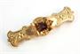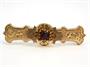 Brož ze silně zlaceného kovu tzv. double zdobená červeným kamenem, z období biedermeieru. Rozměry 5,5 x 1,5 cm. Celková hmotnost 9,04 g.