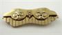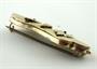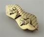 Zlacené stříbro, přírodní říční perličky. Ryzost Ag 800/1000, celková hmotnost 5,13 g. Období a styl: pozdní biedermeier. Elegantní zlacená stříbrná brož se stylizovanými reliéfními liliemi a přírodními říčními perličkami v horní části a s dekorem v podobě svislých linek dole. Značeno: vídeňský rakousko-uherský punc pro cizí zboží a písmena AV. Střední Evropa 1880 - 1900. Výška 17 mm, šířka 55 mm.