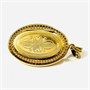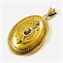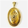 Honosný přívěšek sloužící i jako medailon na fotografie, oválně tělo bohatě plasticky tvarováno a dekorováno ve stylu pozdního biedermeieru. Frontální část v kontrastním lesklém a matovaném zlatavém odstínu, ve středu osazena v mnohokrapnové koruně bílým kamenem, víčko při zadní straně zdobeno jemným gilošováním. Prostor pro fotografii podložen purpurem a opatřeno krycími sklíčky. Kvalitní západoevropská zlatnická práce ze 3. čtvrtiny 19. století.