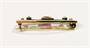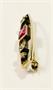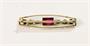 Elegantní zlatá podlouhlá brož ve stylu art-deco osazena syntetickým rubínem obdélného brusu a po stranách doplněno dvěma leukosafíry briliantového brusu. Mezi kameny spojeno zlatými lístečky s jemným gravírováním. Precizní klenotnická práce a vkusný šperk z 20. let 20. století z období 1. republiky. Zhotoveno ze žlutého zlata o ryzosti 585/1000; dovozový punc Z-34 (harfa s písmen Č) a ryzostní číslo na jehle. Hmotnost je 2,12 g. Délka brože je 29 mm, šířka je 7 mm. Zapínání v pořádku. Ve velmi dobrém stavu.