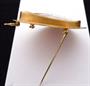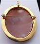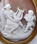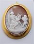 Zlato, ryzost Au 585 / 1000. Celková hmotnost 16,25 gramů. Oválného tvaru, s horním pevným otočným úchytem, vzadu s jehlou a pojistným uzávěrem. Oválná řezaná kamej z mořské mušle - s reliéfním motivem antické sedící bohyně s lyrou, stojícího andílka s rozevřenou knihou s notami. Výjev zobrazený do idylické krajiny s antickou architekturou. Kamej zasazená ve svislém vyvýšeném zlatém okruží, a spodním širším plochém oválném rámečku. Značené - 14 K. . Evropa 1880 - 1930. Výška 5,5 cm, šířka 4,4 cm.