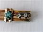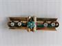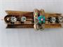 Starožitná zlatá brož osazená čirými kameny, drobnými tyrkysy a říční perličkou, šířka 5 cm, zhotovena ze zlata ryzosti 585 a 520/1000, celková hmotnost 5,5 g.