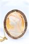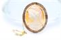 Zlatá brož - kamej. Žluté zlato 375/1000, jehla obecný kov. Kamej. Velikost brože: 3 cm x 2,3 cm.