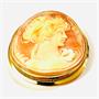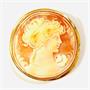 Větší, půvabná kulatá brož, jež lze nosit i jako závěs, dominantou je v přírodní oranžovo-bílé mušlovině řezaná kamej se stylizovaným poprsím dívky, hladký rámeček zdobený pletencem. Západoevropská ruční zlatnická práce z poslední třetiny 20. století.