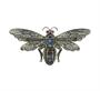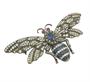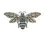 Brož z bílého zlata ryzosti 750/1000 ve tvaru včely zdobená diamanty briliantového brusu o celkové hmotnosti 1,80 ct (SI-PI/H), safíry o celkové hmotnosti 0,90 ct a rubíny o celkové hmotnosti 0,07 ct. Rozměry 6,3 x 3 cm. Celková hmotnost 10,04 g.Povrch šperku rhodiován černým rhodiem.