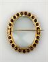 zlatá brož ve tvaru oválného rámečku osazená českými granáty (pyropy), Au btto 12,90g/580/000, Rakousko - Uhersko, kolem r. 1890, značka pražského puncovního úřadu; výška 4,2 cm, šířka 3,5 cm; osvědčení Puncovního úřadu