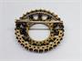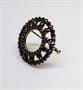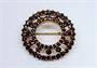 Elegantní zlatá kruhová třístupňová brož tvořená stylizovaným obrazem slunce v obrubě, osazená broušenými českými granáty.