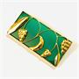 Větší zlatá brož zhotovena dle předlohy z roku 1917 od Dagoberta Pecha (1887–1923), návrháře pro Wiener Werkstätte. V masivním rámu osazeno přírodním středně sytým zeleným chryzoprasem obdélného tabulkového brusu, který je překrytý ručně tepaným zlatým reliéfem z dynamicky kladených stonků, listů a trsů vína. Originální a nápaditý šperk dle předlohy z 20. let 20. století. Mistrovská klenotnická turnovská práce z 90. let 20. století.