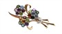 Zlatá brož s diamanty a přírodními kameny. Žluté a bílé zlato 375/1000. Přírodní diamanty, kvalita SI2, barva I - J, celková váha 0,02 ct. Přírodní ametysty, celková váha 1,2 ct. Přírodní citríny, celková váha 0,95 ct. Přírodní granáty, celková váha 1 ct. Přírodní peridoty, celková váha 1,5 ct. Přírodní topazy, celková váha 1,2 ct. Velikost brože: 5,5 cm x 3,5 cm. Váha brože: 11,97 g.